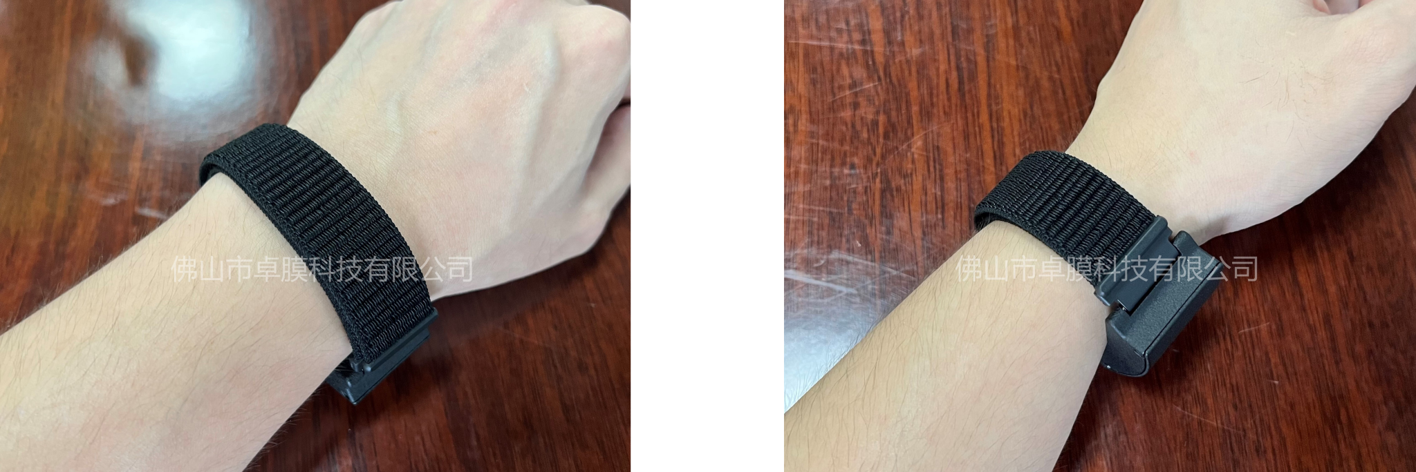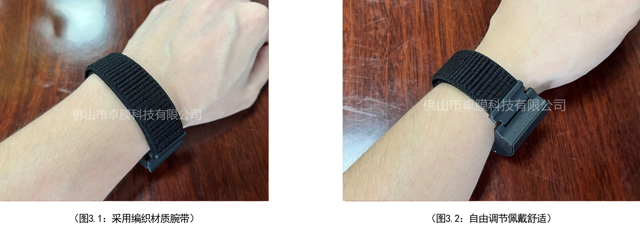 同时,编织材质的腕带,重量更轻,更透气,柔软亲肤不易过敏,并且可根据不同手腕尺寸自由调节,适配性更好(见图3.1,图3.2)。而且手环在整个测量过程无需充气加压,不会给手腕带来肿胀和压迫的感觉。使用时不会产生噪音,可避免给周围的人带来困扰。