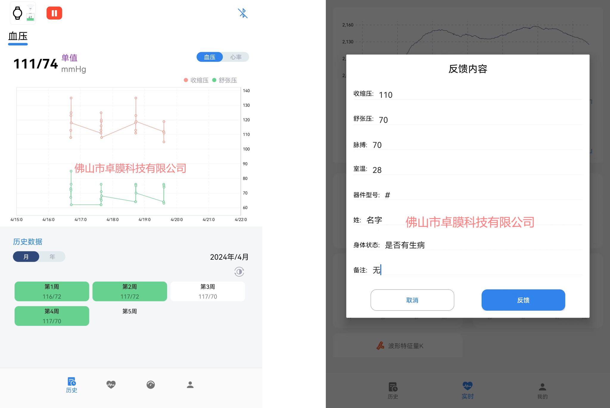 研发团队为健康手环设计的配套使用APP,支持在手机端和平板电脑端安装使用。手环与APP通过无线蓝牙连接,两端之间实现快速的数据交互。