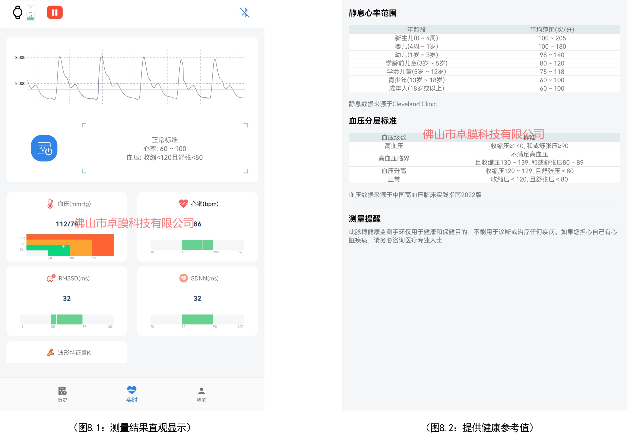 APP的UI界面美观简洁,操作简单易上手。正确佩戴手环并开启数据采集功能后,测试界面会实时显示当前的脉搏波形,继而点击对应按钮即可开始测量。只需等待几十秒的数据采集和计算,心率、血压的收缩压/舒张压、HRV等测量结果数值便直观显示在界面上(见图8.1)。同时,APP还会提供每个健康值对应的参考标准和说明,帮助大家准确评估自己的健康状况(见图8.2)。