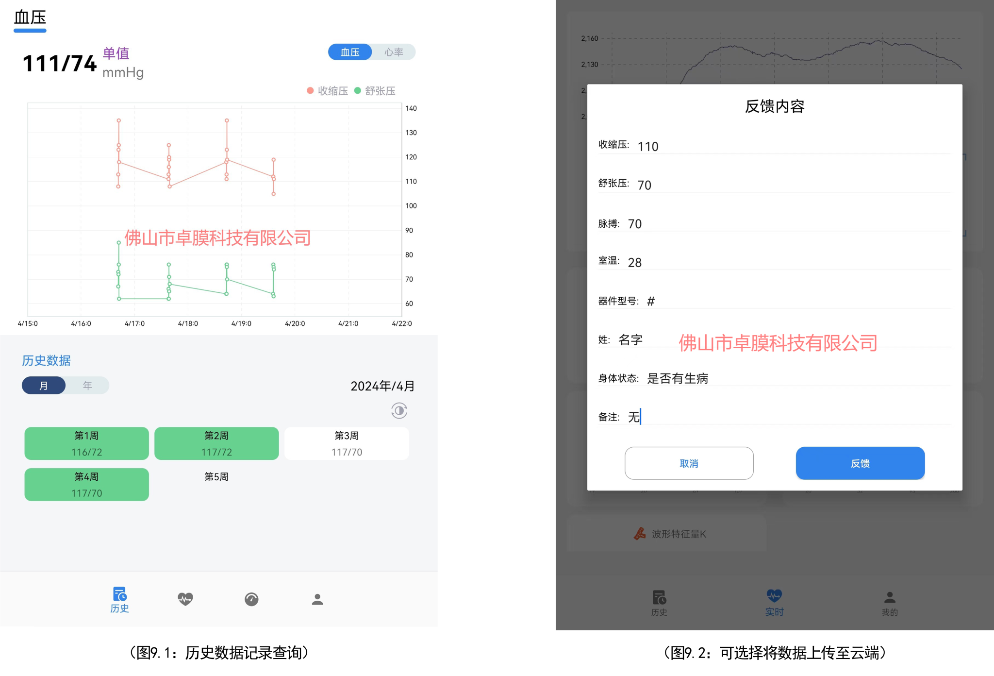 APP还为大家提供多项便捷的测量数据记录和查询功能。一方面,每一次的测量数据都会自动保存在本地,我们可以通过日历视图观察不同时间段的数值和变化,轻松回顾和分析自己过去的健康状况(见图9.1)。另一方面,您也可以选择将测量数据同步储存至云服务器,既能减少数据丢失风险,也能方便数据在不同设备上得到及时更新,进一步帮助大家长期追踪和管理个人健康(见图9.2)。