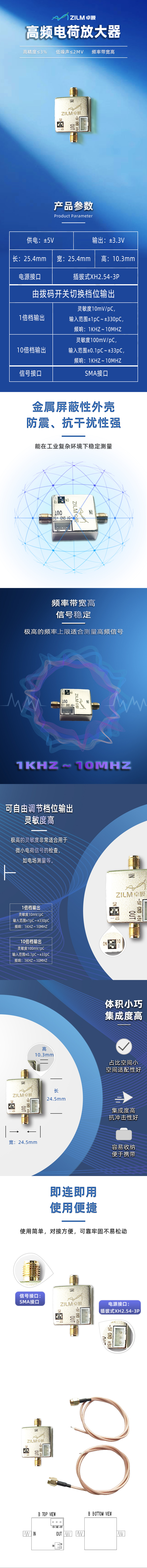 高频电荷放大器用于压电片,加速度传感器,振动、冲击力等电荷测量场合,极高的灵敏度非常适合用于微小电荷信号的检查,如电场测量等;极高的频率上限适合测量高频信号。