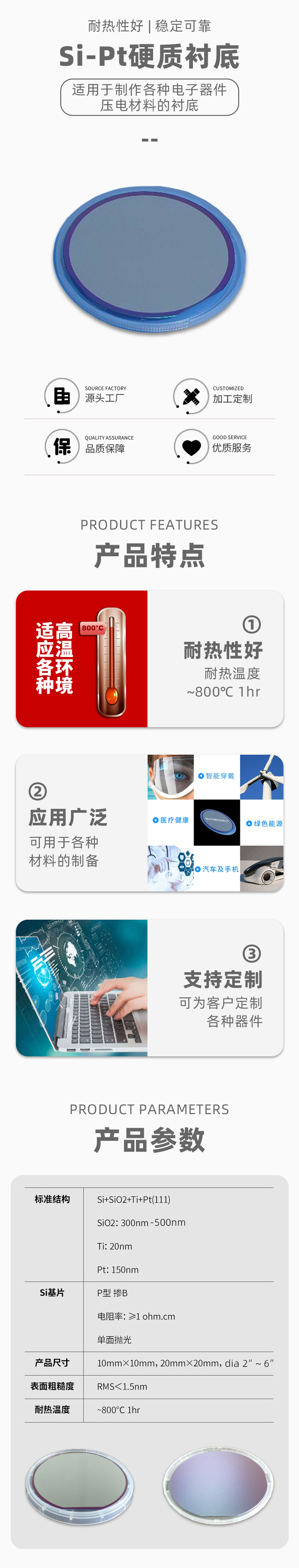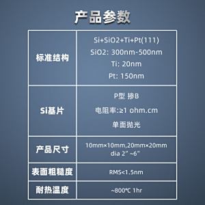 Si+SiO2+Ti+Pt(111) SiO2: 300nm-500nm Ti: 20nm Pt: 150nm | P型掺B 电阻率:≥1 ohm.cm 单面抛光 | 10mm×10mm,20mm×20mm dia 2"~6" | RMS<1.5nm | ~800℃ 1hr | 稳定性好、耐高温、可广泛应用、支持产品定制 |